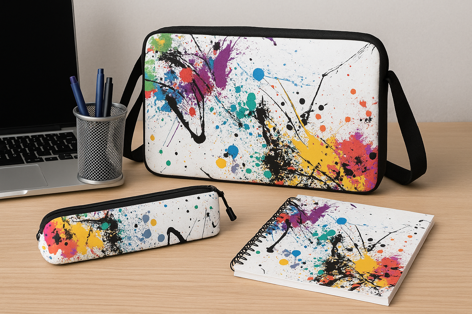 Bundle includes a vibrant full-print laptop bag, a stylish notebook (hardcover), and a versatile pencil case. Perfect for studying, planning, and daily use with durable materials and eye-catching designs
