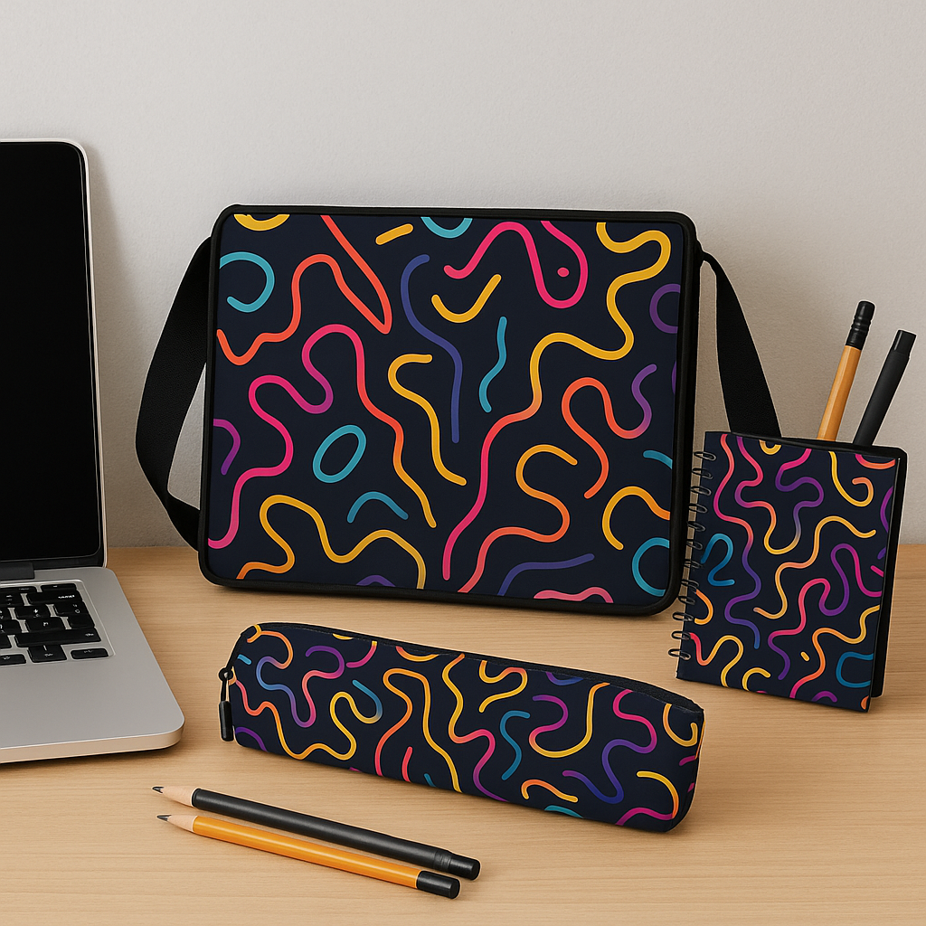 Bundle includes a vibrant full-print laptop bag, a stylish notebook (hardcover), and a versatile pencil case. Perfect for studying, planning, and daily use with durable materials and eye-catching designs