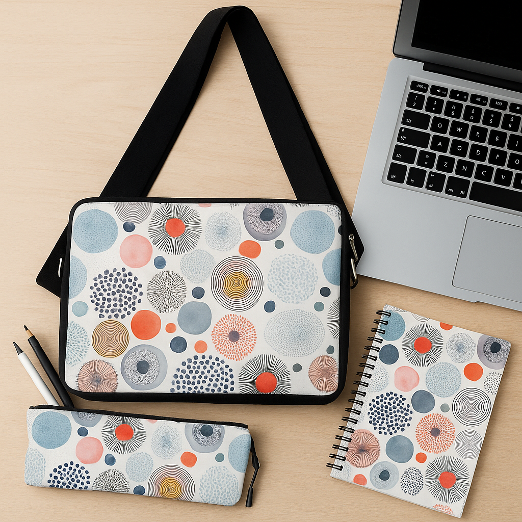 Bundle includes a vibrant full-print laptop bag, a stylish notebook (hardcover), and a versatile pencil case. Perfect for studying, planning, and daily use with durable materials and eye-catching designs